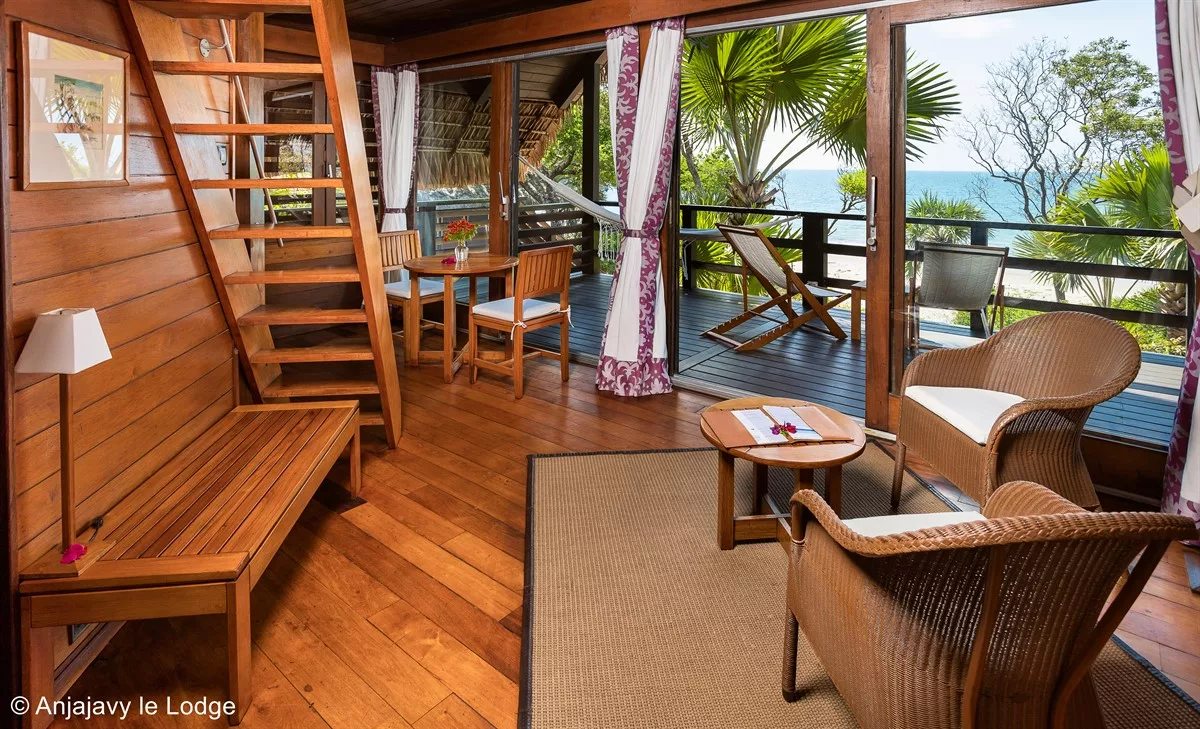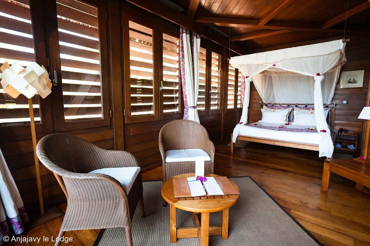 Anjajavy le lodge marie harmonieusement son architecture sophistiquée avec le paysage environnant. Les 24 villas en bois précieux offrent toute une terrasse donnant sur la mer, idéale pour se relaxer après une journée d’exploration.