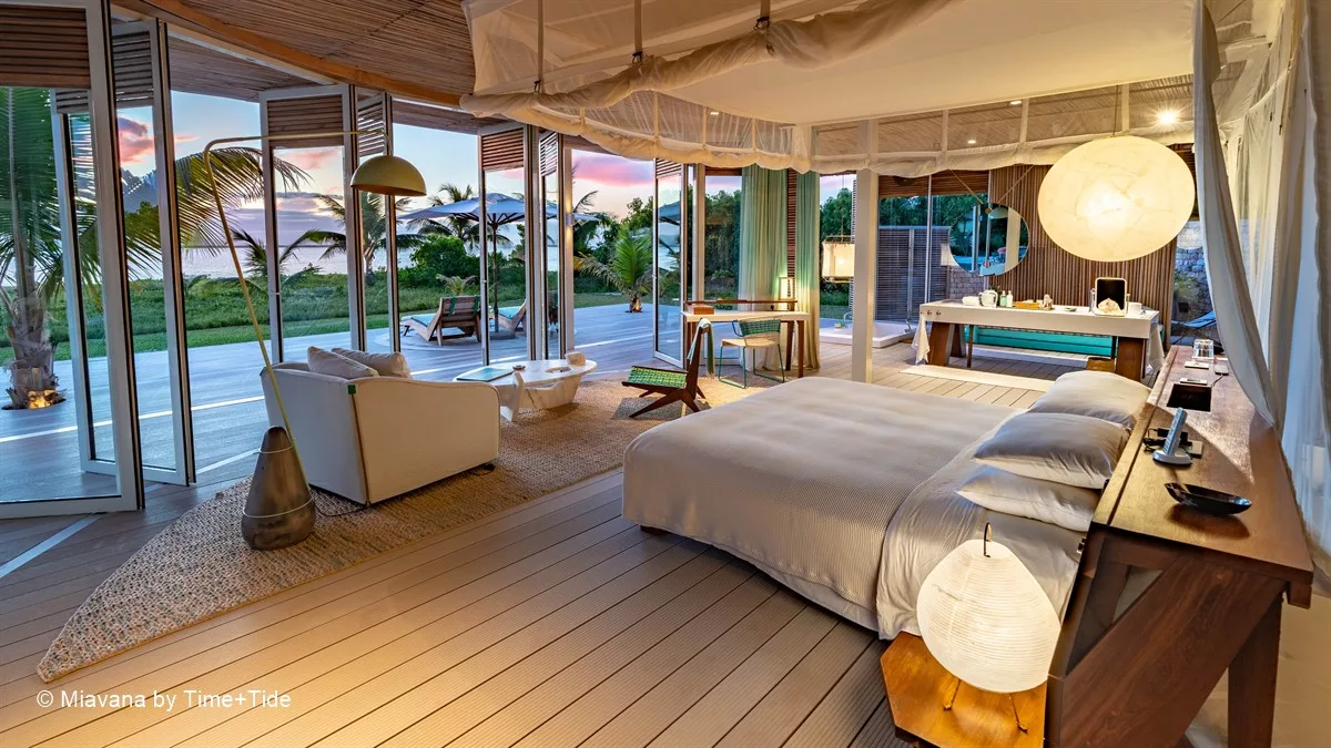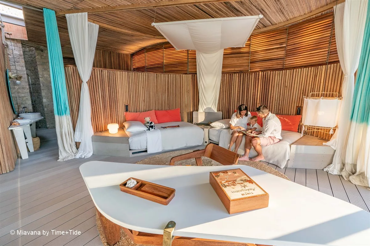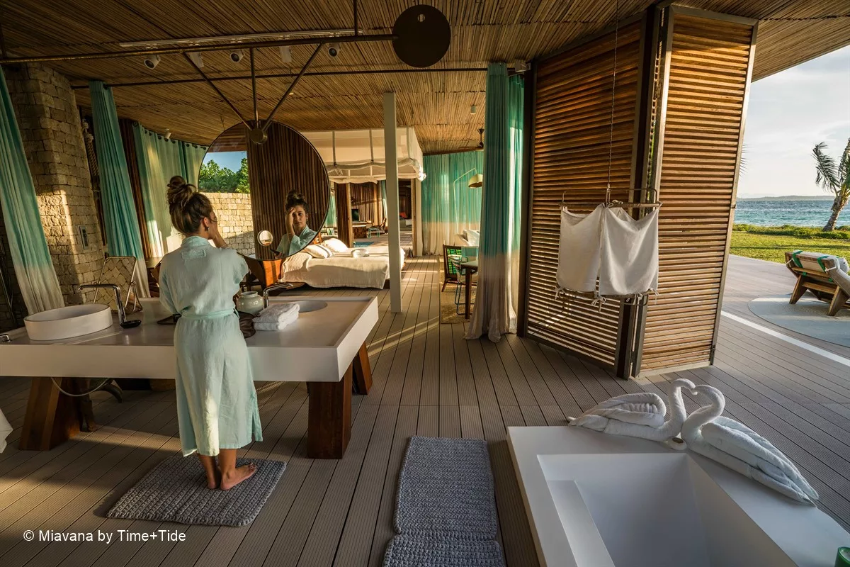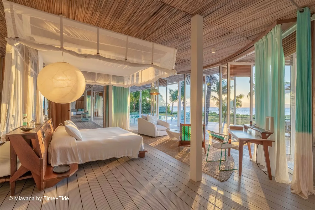 Les somptueuses villas, conçues pour fusionner harmonieusement avec leur environnement, vous invitent à plonger au cœur de la vie insulaire. Inspirés par les éléments marins, du sable et de l’air, les intérieurs mettent en valeur des textiles teints à la main aux nuances turquoise, du bois malgache et de la pierre locale finement taillée. Chacune des 14 villas privées dispose d’une véranda surplombant l’océan et d’une piscine privée, tandis que les fenêtres en verre rétractables, du sol au plafond, offrent une vue panoramique sur les eaux scintillantes. L’espace intérieur comprend un salon spacieux, un coin repas, une kitchenette entièrement équipée, un minibar, un coffre-fort, une climatisation écologique, ainsi qu’une douche intérieure et extérieure offrant une vue imprenable sur l’océan.